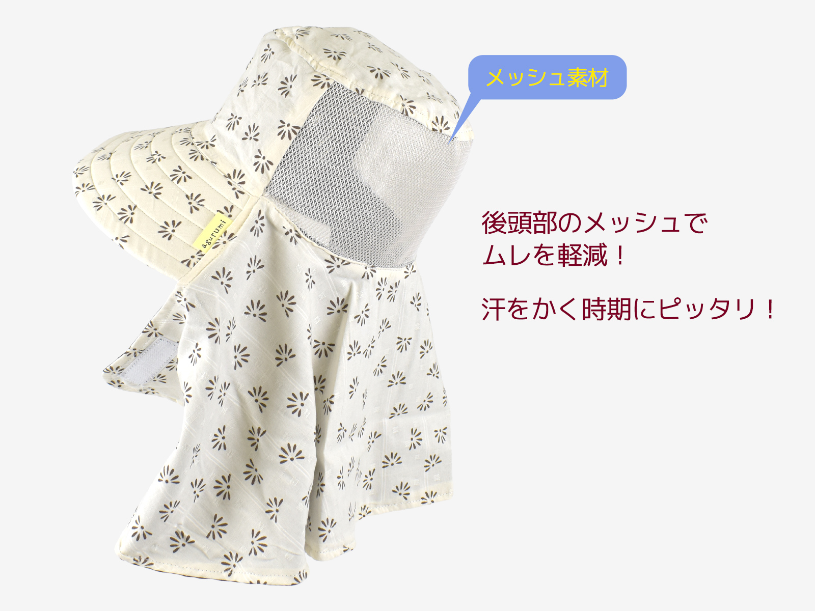 帽子の両サイドの垂れからマジックテープで止めて顔全体を包みこみ、より一層紫外線をカット。