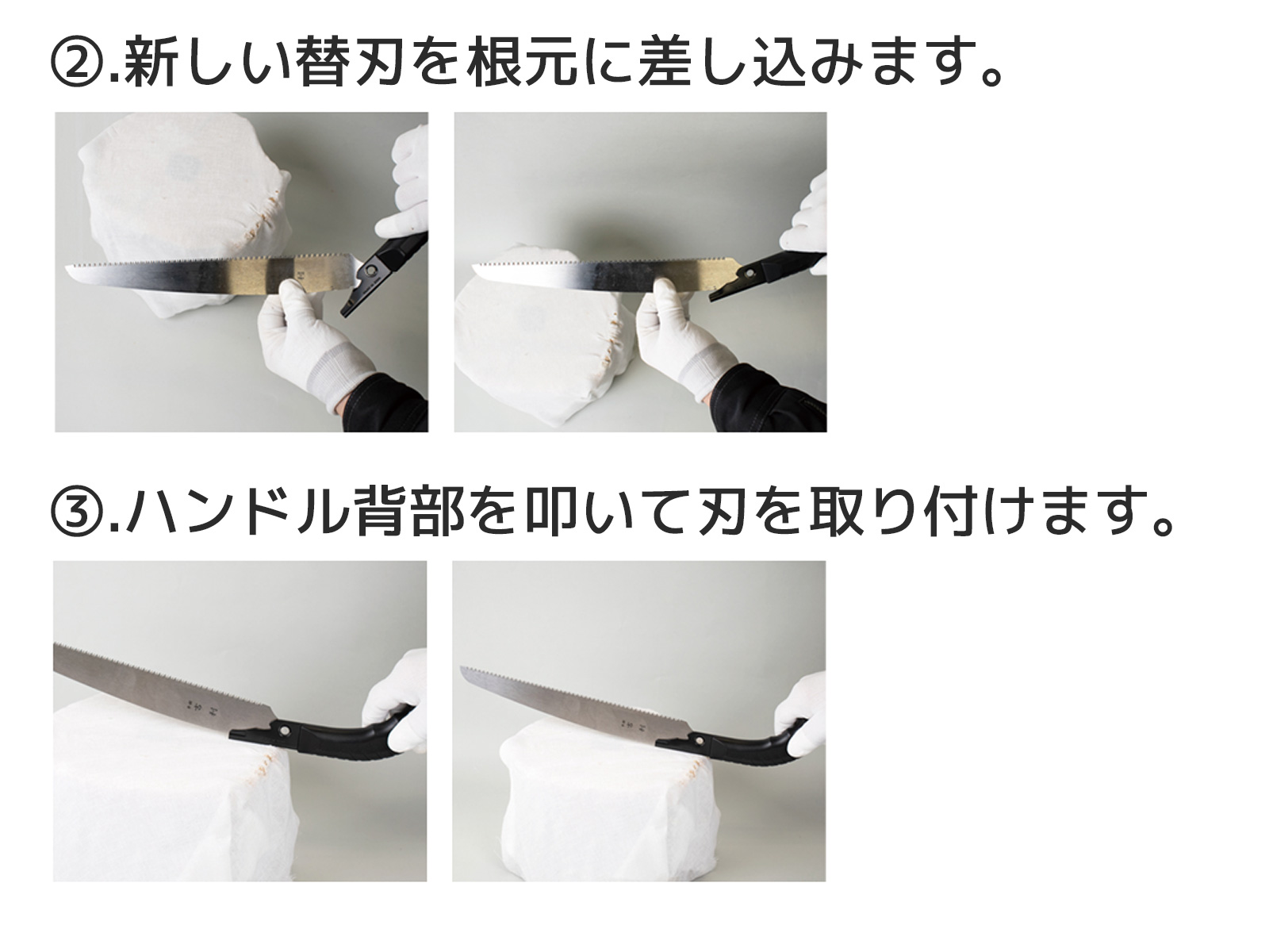 生木の太さに合うサイズの鋸をお使い下さい。 無理な力で挽いたりこじったりすると刃欠けや折れの原因になりますのでご注意下さい。 切れ味が落ちたり鋸刃に支障が出たら替刃の交換をお願いします。